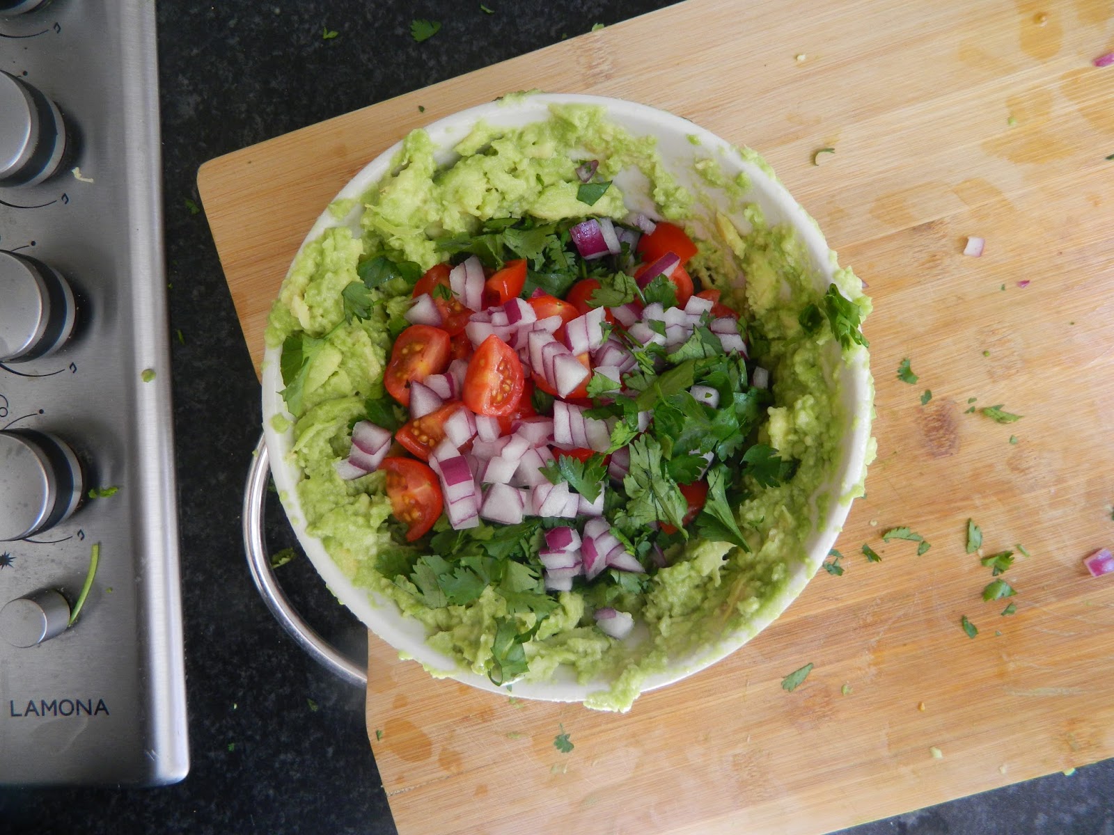 Firstly mash up all the avocados - use your hands even - it doesn't matter. Depending on how chunky you want it just mash it up as much as you like. I personally have mine that tiny bit chunkier - purely because I love avocados. Once you've mashed them to the consistency you like then you add the other bits (all chopped up).