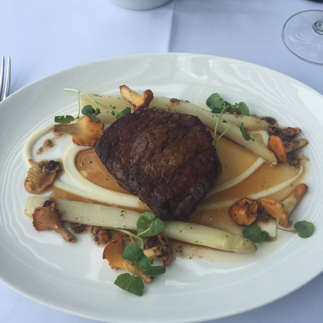 We get hold of the menus and start considering our mains. Naturally I am drawn to red meat - I don't know why but whenever I go out to eat I usually opt for a red meat. Shame about my inability to drink red wine not infront of the tv. I end up opting for the beef fillet with white asparagus and mushrooms. I have to admit - it took some time choosing. Their mains really do look quite incredible and had the person I was with wanted the same I would have opted for the chateaubriand as it looked amazing when I saw it being served at the surrounding tables.